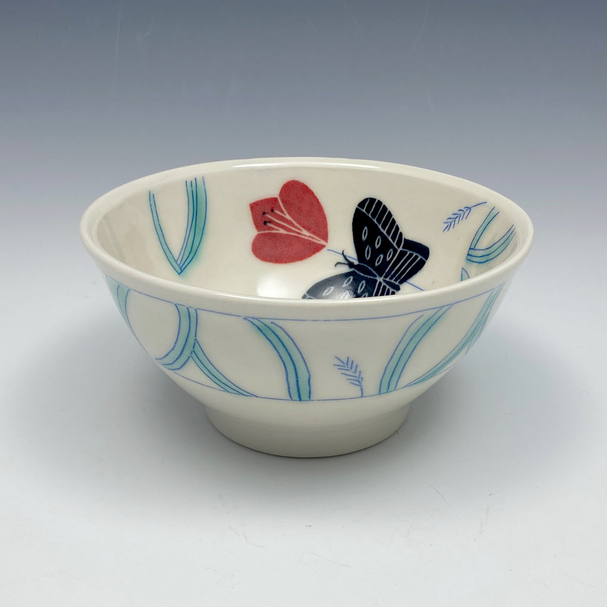 Personal bowl with black butterfly decoration. Wheel thrown on a potter's wheel. Decoration is done using my favorite mishima technique.