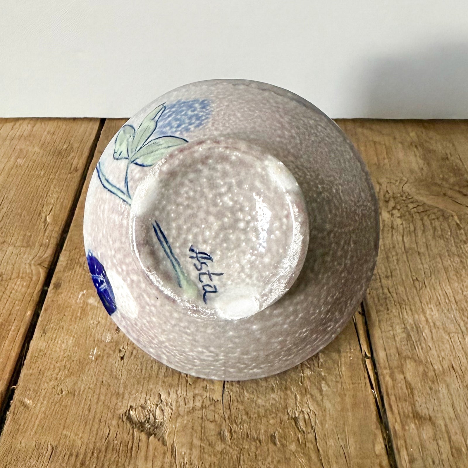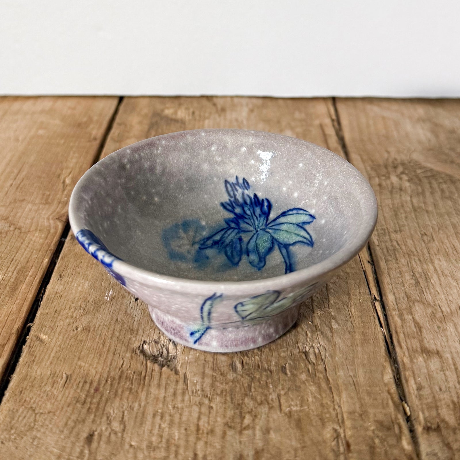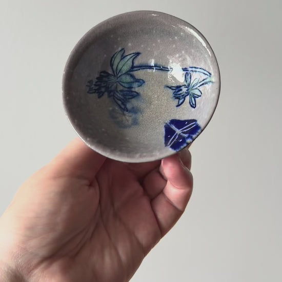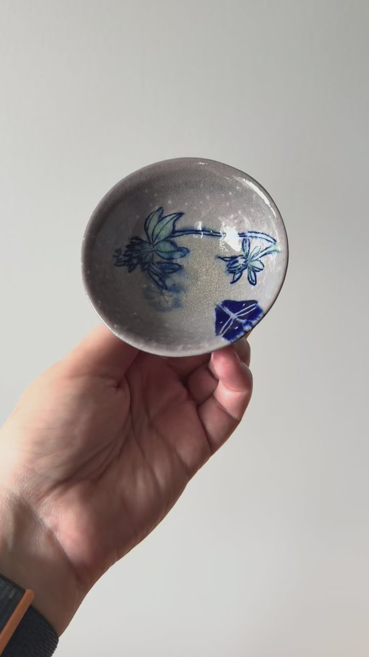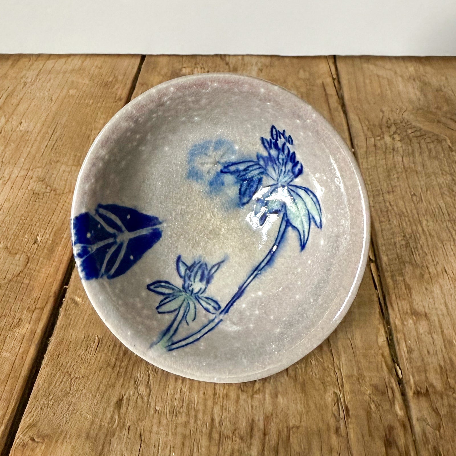 Small dish / trinket dish with clovers, inspired by beautiful clover meadows in Maine. I made this dish at my residency in Watershed Ceramics and fired in a group firing in a soda kiln. Soda firing is done in a gas kiln and soda is introduced into a kiln at high temperatures. Soda vaporizes and creates a glaze with varied effects on the surface of ceramics.