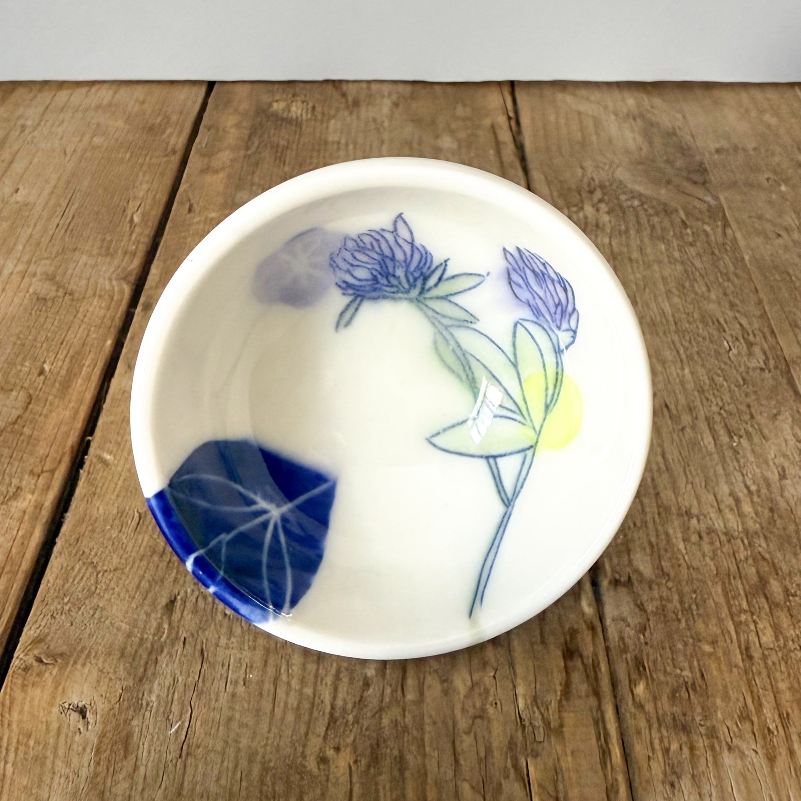 Small dish / trinket dish with clovers, inspired by beautiful meadows in Maine. I made this dish at my residency in Watershed Ceramics and fired in an electric kiln.